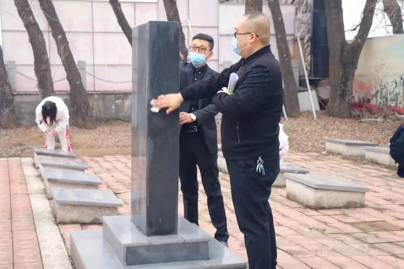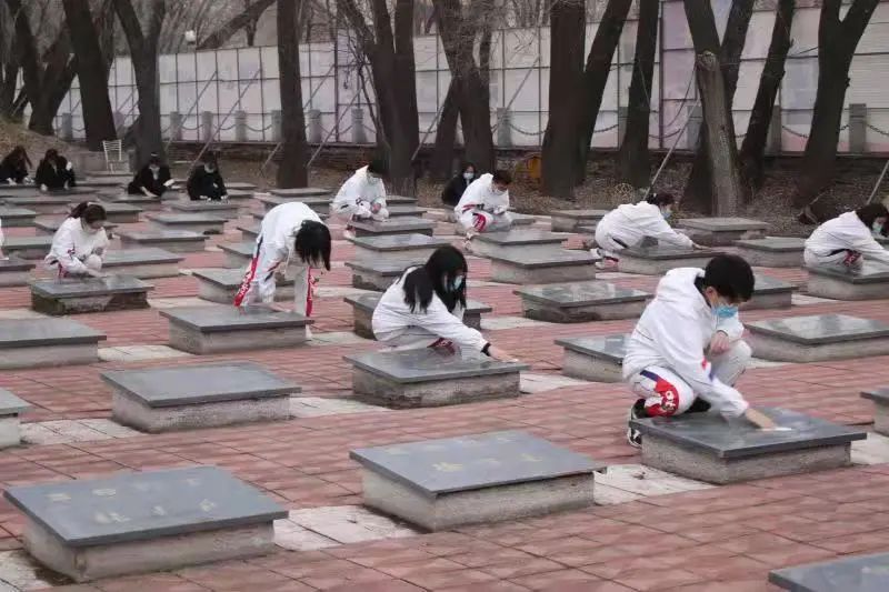 在实践教育活动中,全体教师代表和学生代表在庄严凝重的气氛中共同瞻仰并擦拭烈士墓碑,致敬英雄前辈们忠贞如铁的革命意志,感念每一位在守护国家领土、寻求独立解放、捍卫民族尊严道路上抛头颅热血的共产主义战士。