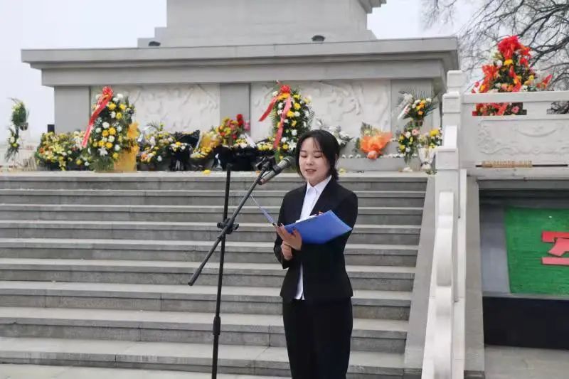教师代表向人民英烈纪念碑敬献花篮;全体肃立默哀并向烈士纪念碑鞠躬;2018级学生代表韩鑫洋在巍峨肃穆的纪念碑前做主题发言,她讲到:“作为新时代的大学生,一定要学习革命先烈身上不怕困难、不畏艰险的精神,做到心中有祖国,肩上有责任,身上有正气,在以后的日子里勤于学习,刻苦磨砺,增强本领,让青春之花绽放在祖国最需要的地方”。