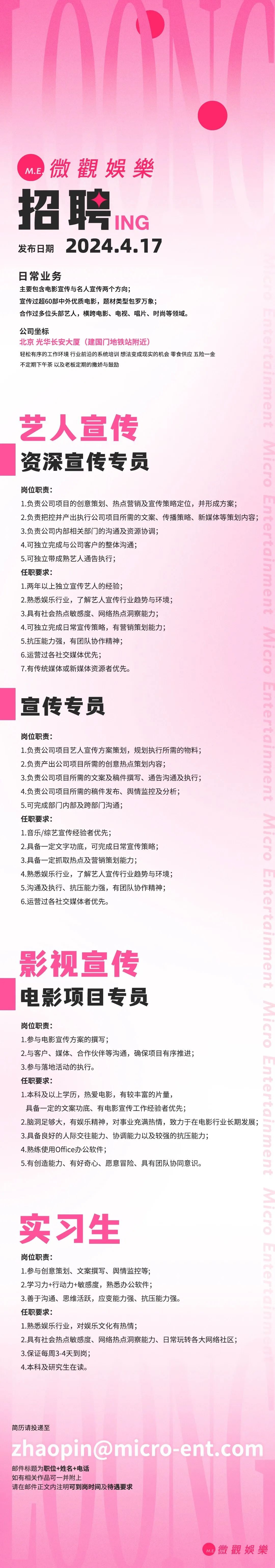 就业指导丨微观娱乐招聘艺人宣传、影视宣传、实习生