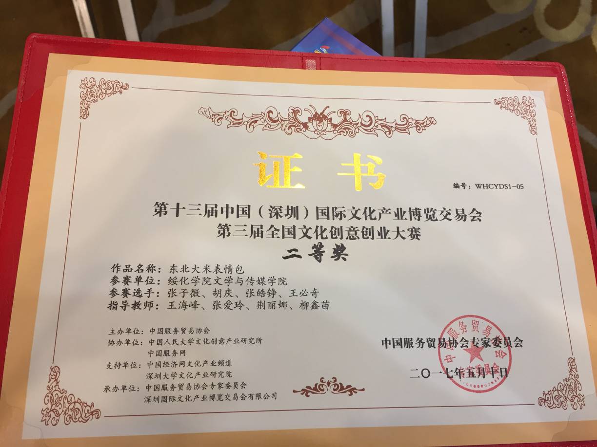 5月10日,beat365平台官方网站“东北大米表情包”创意作品在深圳第三届全国文化创意创业大赛中获得二等奖。项目负责人2016级学生张子微代表创意团队接受了颁奖。大赛评委对作品的创意理念及开发前景给予了充分肯定。