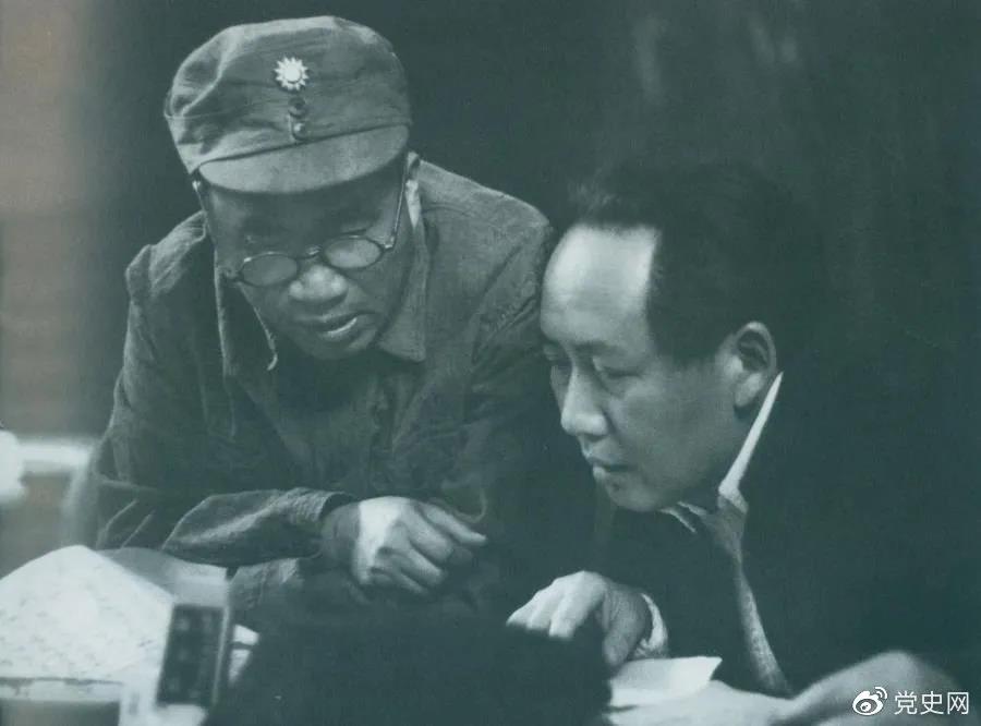 1945年4月,毛泽东和朱德在中国共产党第七次全国代表大会上。