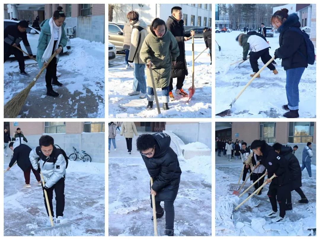 活动开始,各班班长将清雪工具分发给同学,同学们有序地清理道路积雪。大家团结协作、不畏严寒,他们有的挥舞铁锹铲起雪块,有的手拿扫帚清扫路面。经过半个多小时的打扫,汇文楼广场及西侧小路的积雪基本清除。