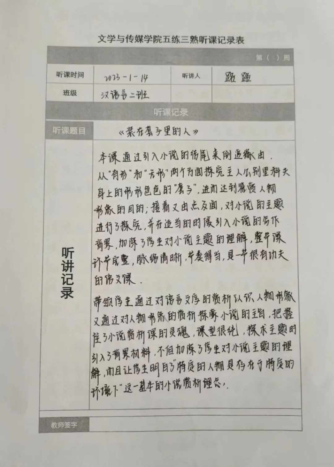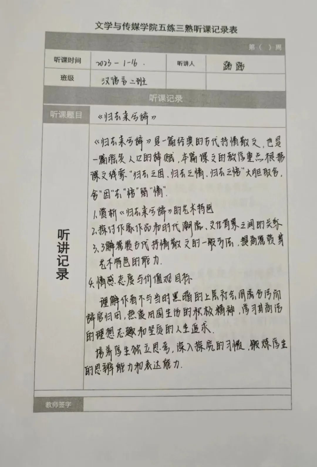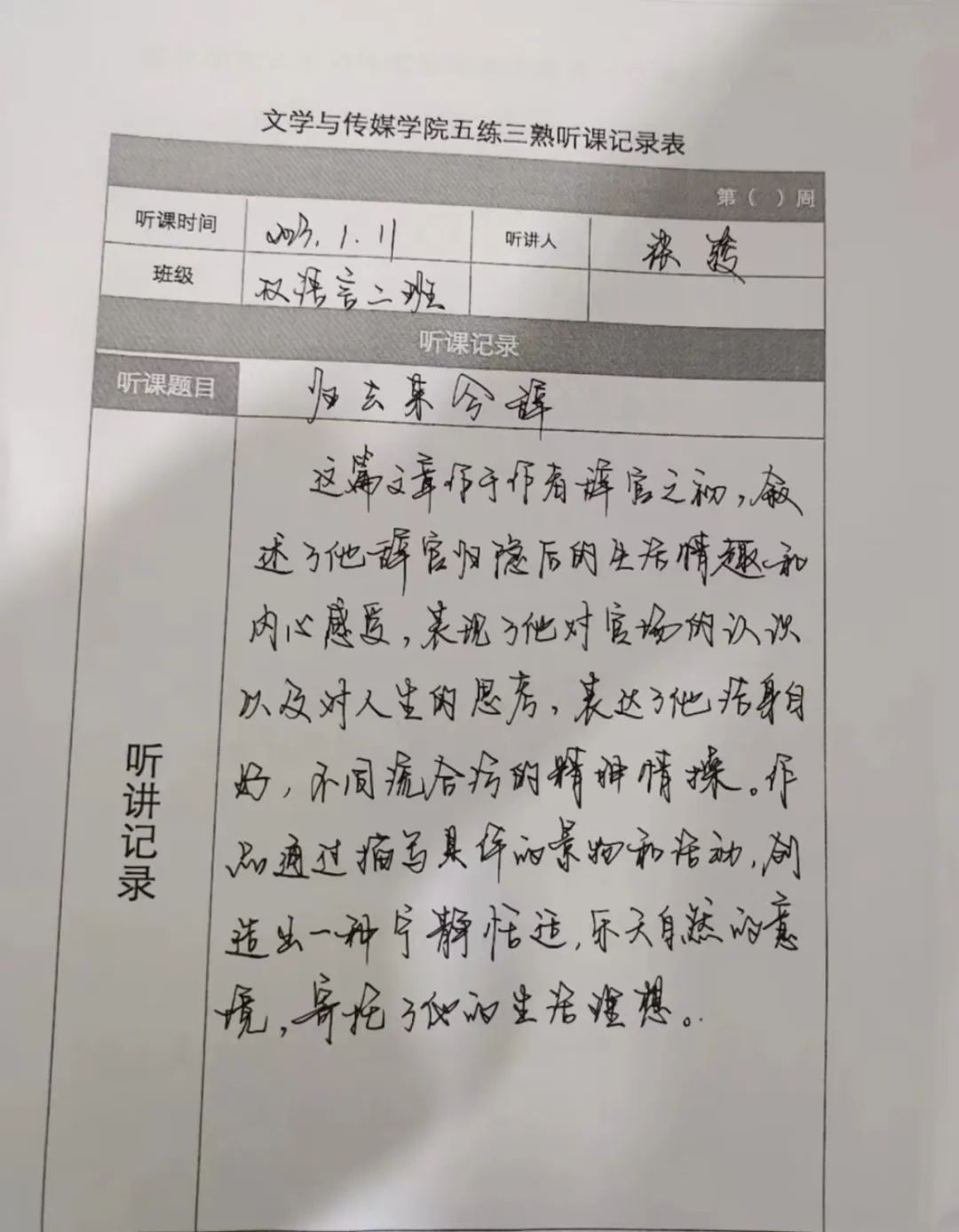 听课记录是听课的第一手资料,是课后进行教学反思交流的材料和依据,更是促进教师专业成长和提高教学水平的极其宝贵财富,为使汉语言专业学生更好的学习专业技能,beat365平台官方网站特开展听课笔记优秀作品展示活动,让我们一起来看看同学们的听课记录表吧!