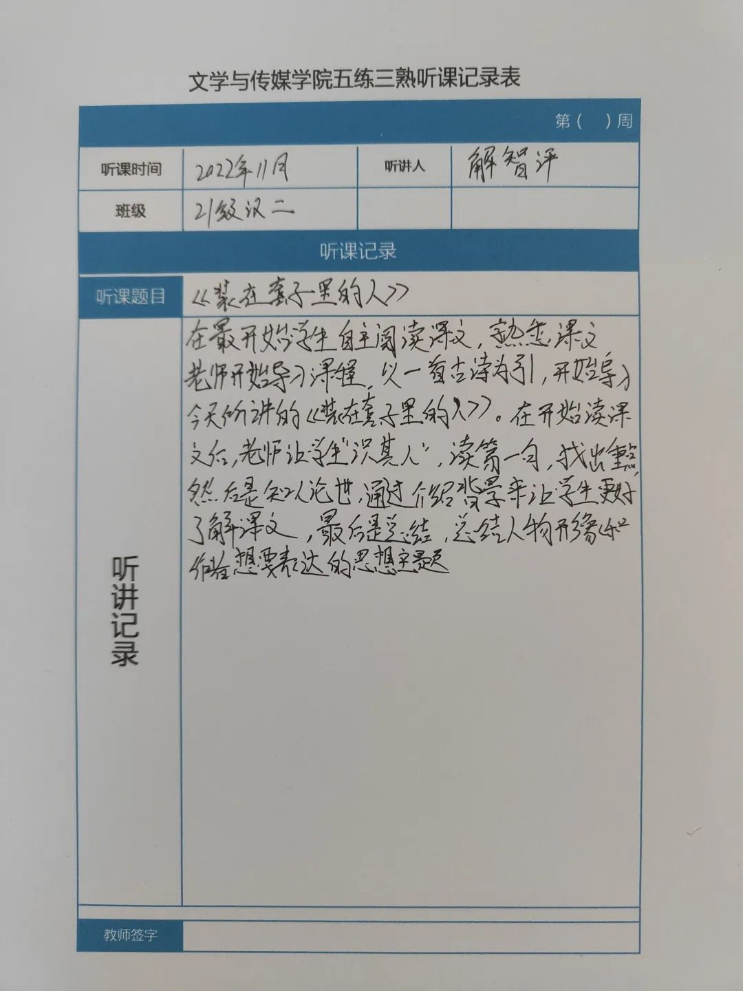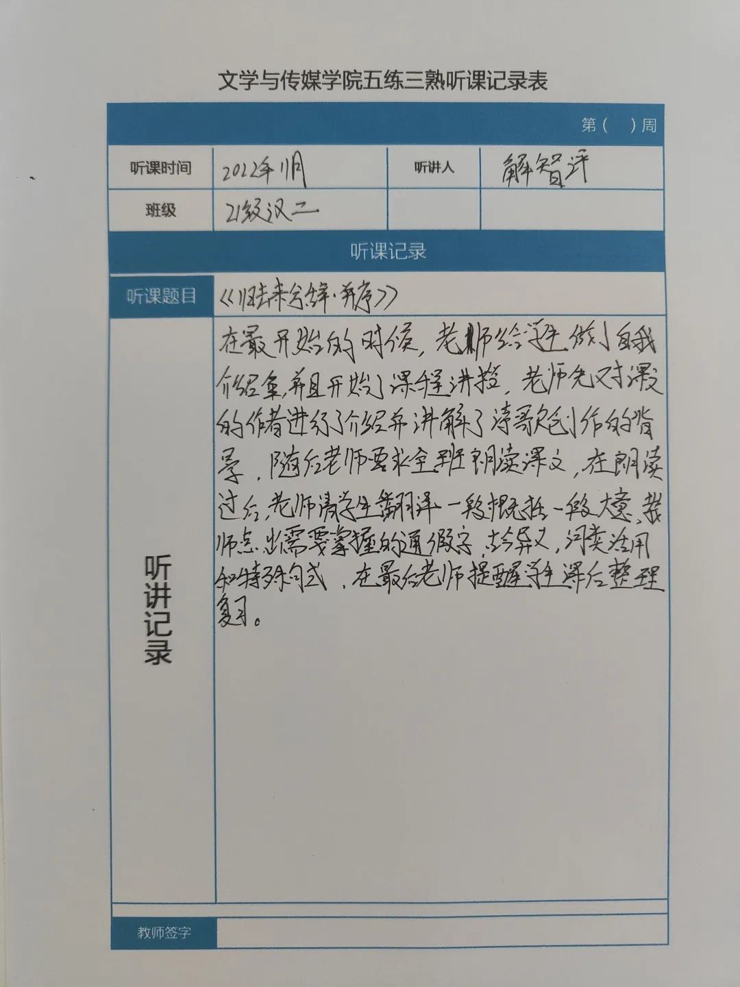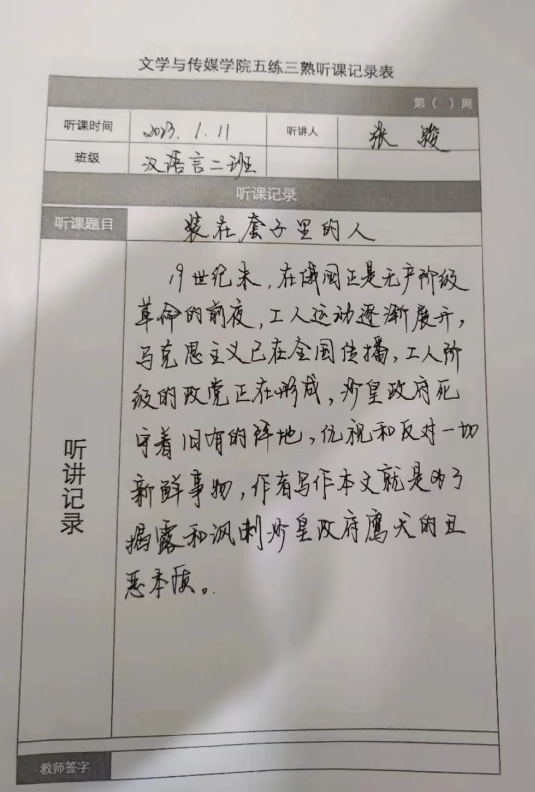 听课记录是听课的第一手资料,是课后进行教学反思交流的材料和依据,更是促进教师专业成长和提高教学水平的极其宝贵财富,为使汉语言专业学生更好的学习专业技能,beat365平台官方网站特开展听课笔记优秀作品展示活动,让我们一起来看看同学们的听课记录表吧!