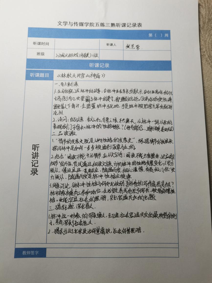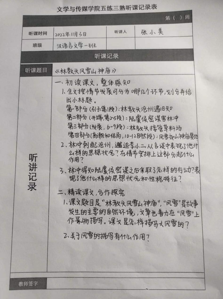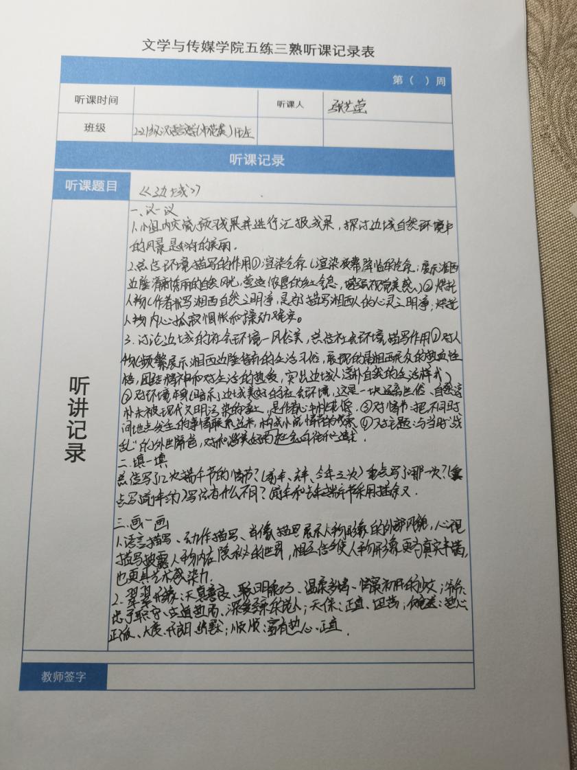 听课记录是听课的第一手资料,是课后进行教学反思交流的材料和依据,更是促进教师专业成长和提高教学水平的极其宝贵财富,为使汉语言专业学生更好的学习专业技能,beat365平台官方网站特开展听课笔记优秀作品展示活动,让我们一起来看看同学们的听课记录表吧!