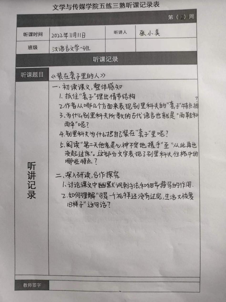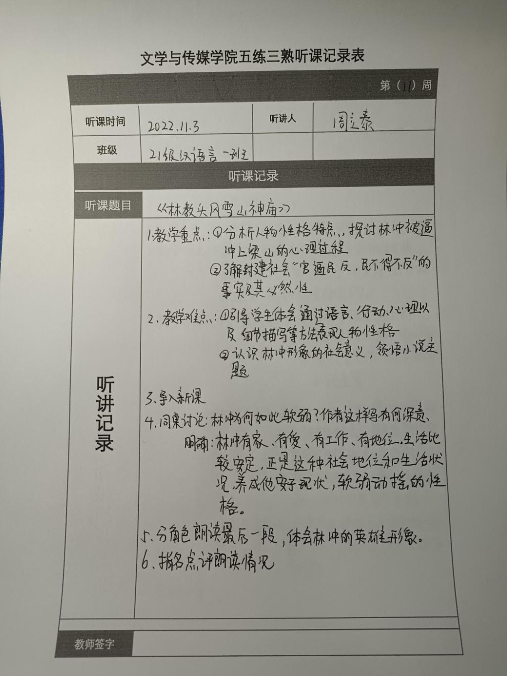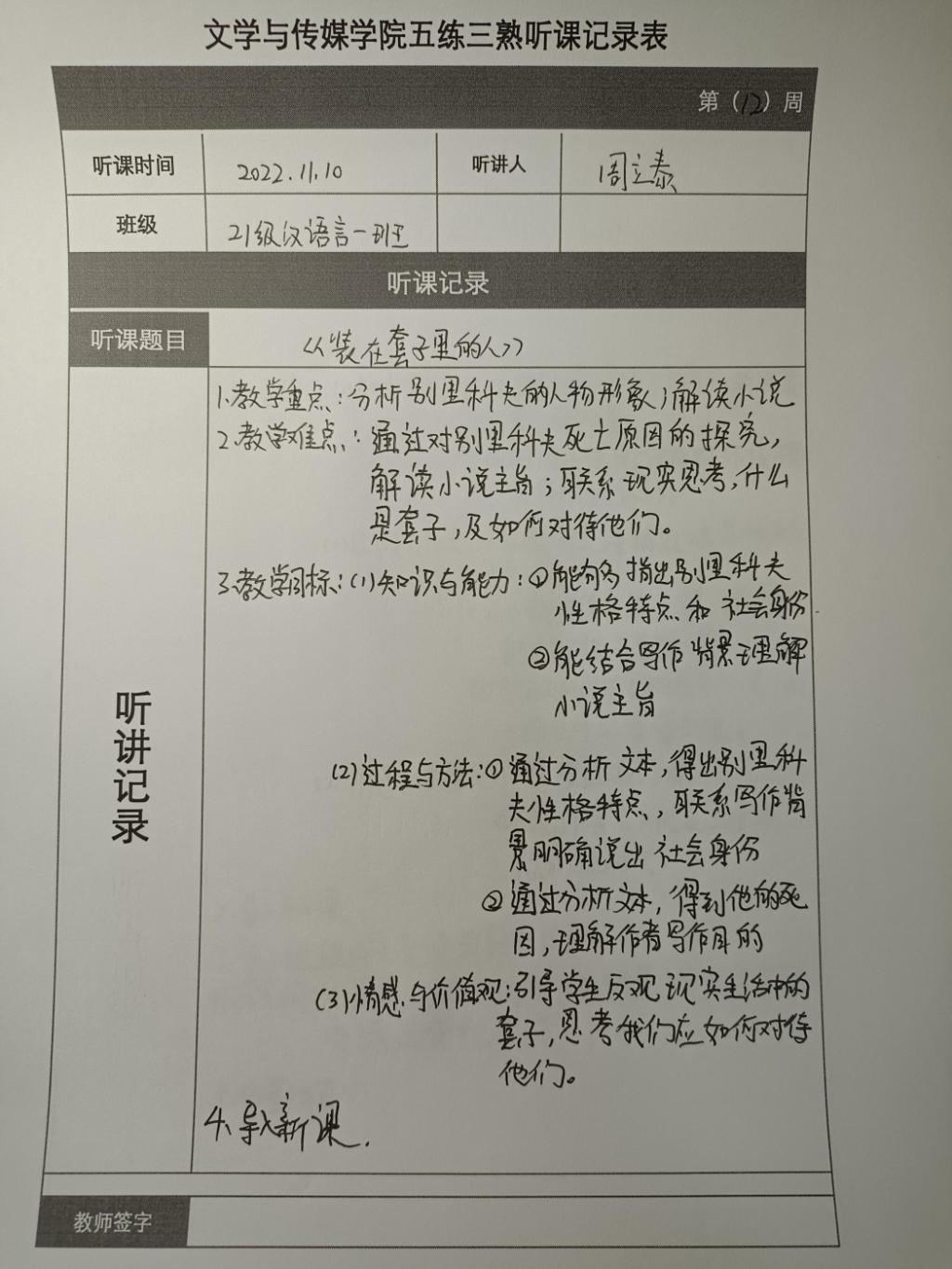 听课记录是听课的第一手资料,是课后进行教学反思交流的材料和依据,更是促进教师专业成长和提高教学水平的极其宝贵财富,为使汉语言专业学生更好的学习专业技能,beat365平台官方网站特开展听课笔记优秀作品展示活动,让我们一起来看看同学们的听课记录表吧!