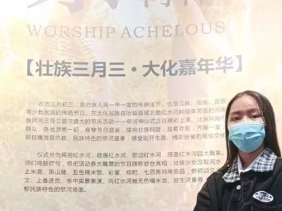 本次社会实践谭依妹同学来到家乡的博物馆,在那里她学习到了壮族相关的传统文化以及服饰特点,并明白中国传统节日的深刻意义。参观完整个博物馆之后,她表示自己深切感受到了中华文化的博大精深、源远流长,文化是民族的灵魂,传承文化是时代赋予我们的责任,我们应当汲取传统文化的思想智慧、弘扬中华文化、坚定文化自信、坚守文化的传承与创新。