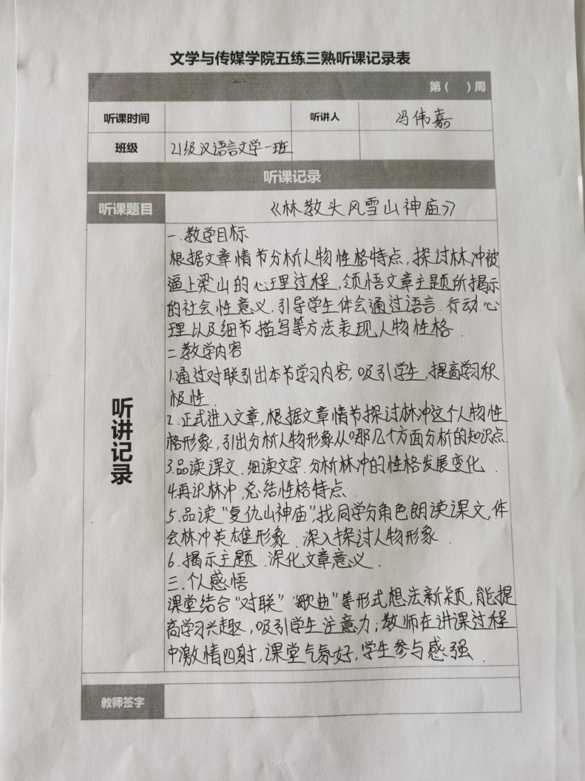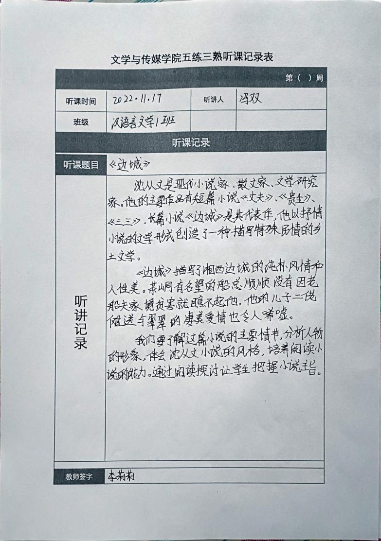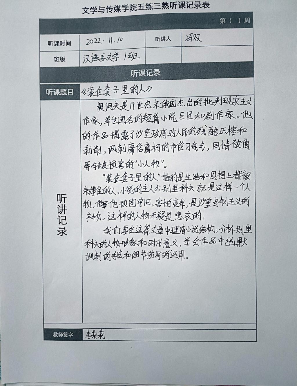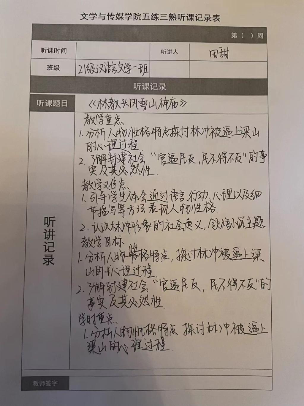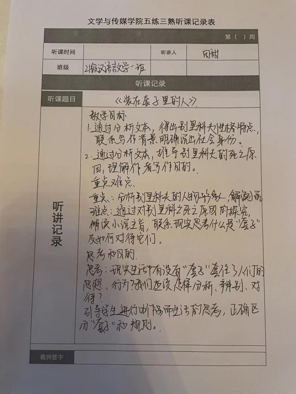 听课记录是听课的第一手资料,是课后进行教学反思交流的材料和依据,更是促进教师专业成长和提高教学水平的极其宝贵财富,为使汉语言专业学生更好的学习专业技能,beat365平台官方网站特开展听课笔记优秀作品展示活动,让我们一起来看看同学们的听课记录表吧!