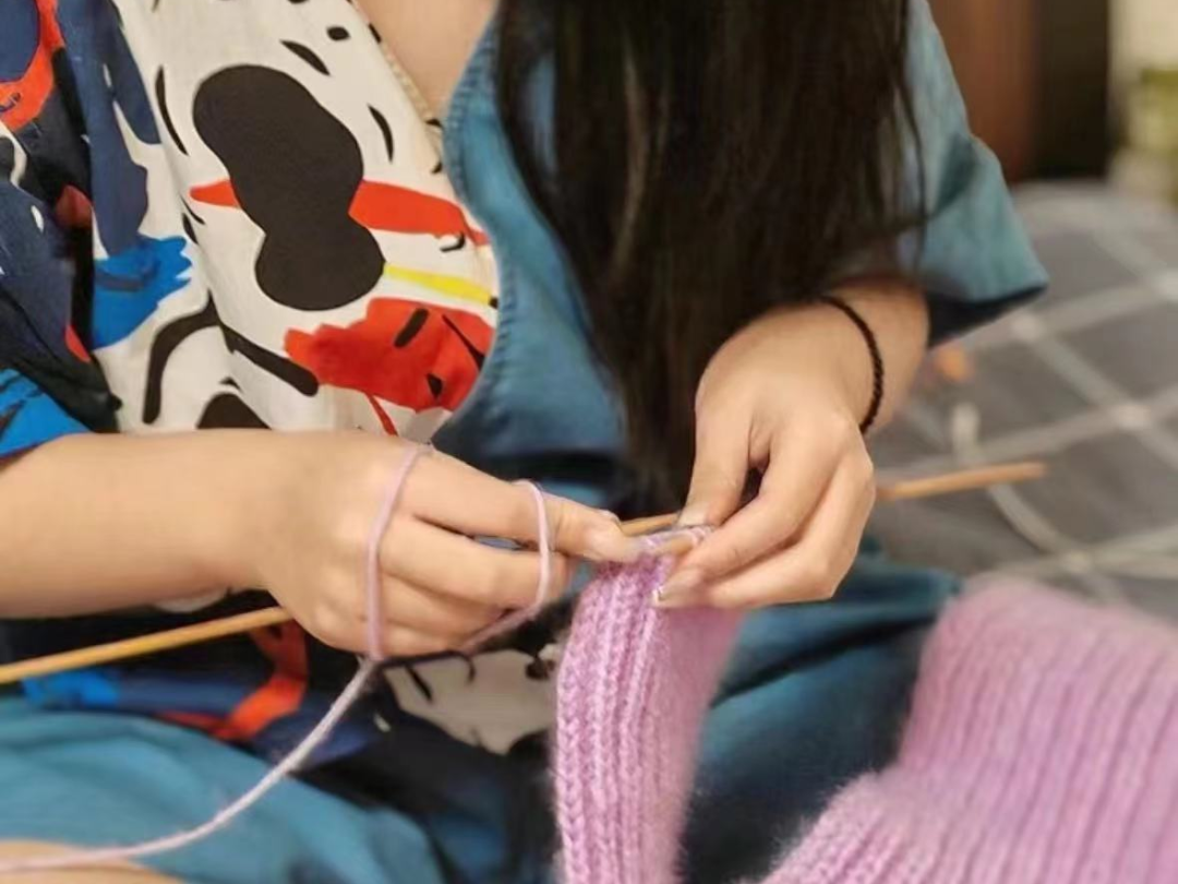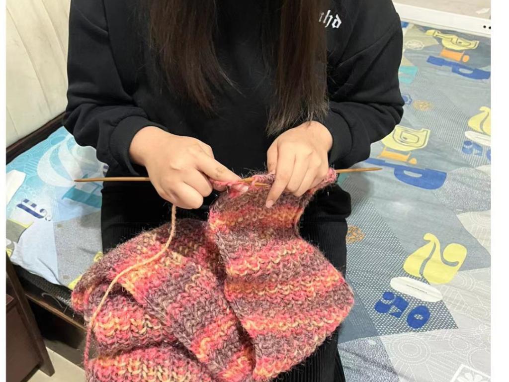 2023级杨悦同学积极参加实践活动,她敢于尝试,用心学习,在家人的帮助下,熟练掌握技艺,始终将为留守儿童送去温暖与爱心融入一针一线中。