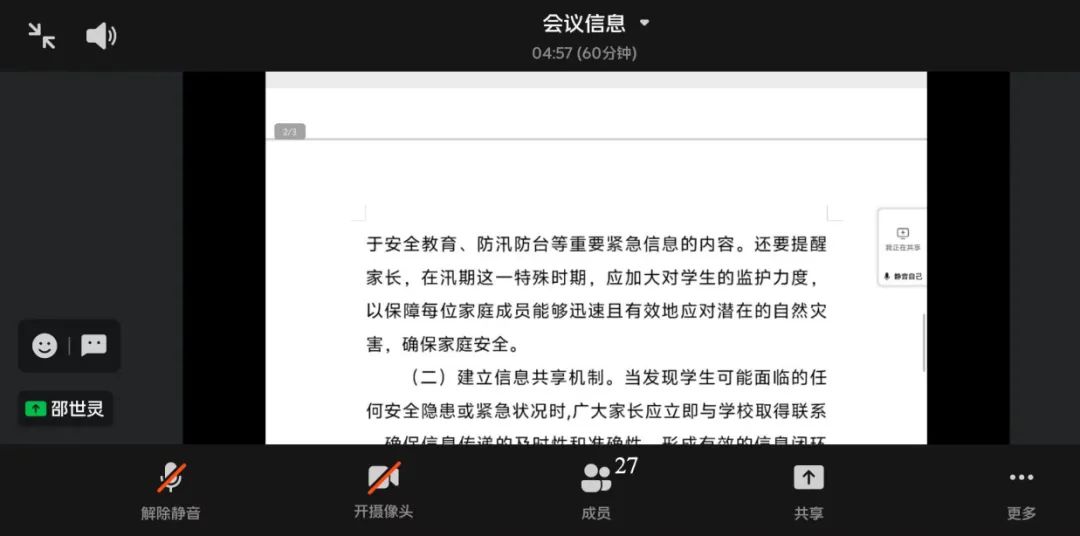 首先加强防汛教育,增强防汛意识,密切关注气象动态。提醒广大学生密切关注当地气象部门发布的天气预报及预警信息,提前规划并落实相应的防范措施,尽量避免极端天气出行,确保安全。在线上班会中,各班对学生进行了“防汛、防雷、防水、山洪、暴雨、雷击、泥石流、山体滑坡、地震”等系列性的安全知识教育,增强学生们对防汛的安全意识,同学们也学习了很多关于防洪防汛的知识,了解了当洪水发生时,一定要冷静,不要惊慌,要迅速寻找合适的方法离开现场。