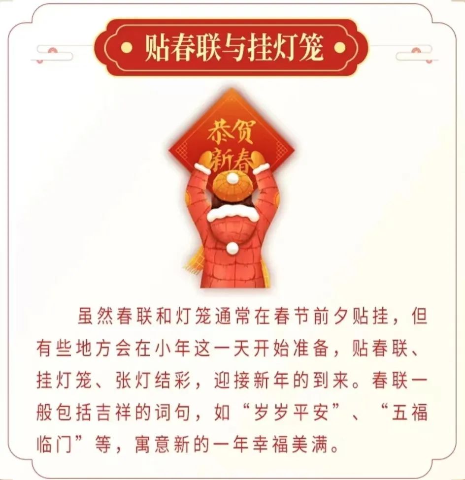 小年,中国传统节日,也称“交年节”、“灶神节”、“祭灶节”等。小年的民俗活动主要有扫尘、祭灶等。中国幅员辽阔,各地风俗有很大的差异,由于各地风俗不同,被称为“小年”的日子也不尽相同。中国南方大多数地区以腊月二十四为“小年”,中国北方大多数地区以腊月二十三为“小年”。但不管是哪天,“小年”可都不小。这天以后,人们开始进入准备过年的阶段,准备干干净净过个好年,表达了人们一种辞旧迎新、迎祥纳福的美好愿望。