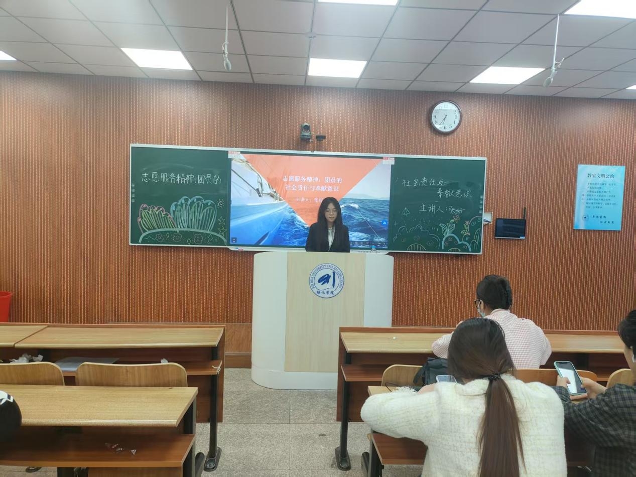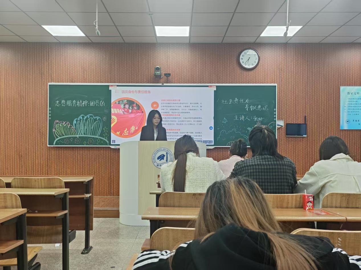 团课伊始,张好从志愿服务精神的重要意义切入,指出志愿服务精神是团员践行社会责任的重要体现,承载着共青团员服务社会、奉献他人的初心与使命。随后,她围绕志愿服务精神的核心内涵展开讲解,阐述了“奉献、友爱、互助、进步”的志愿服务精神与共青团作为党的助手和后备军的政治定位之间的紧密联系,系统剖析了团员参与志愿服务的意义、主要形式以及规范要求,并着重强调新时代青年团员应如何将志愿服务精神融入日常学习、生活及社会实践。同时,她号召同学们树立“服务社会、奉献他人”的意识,在专业学习之余积极参与各类志愿服务活动,在实践中锤炼本领,以实际行动践行“请党放心,强国有我”的青春誓言。