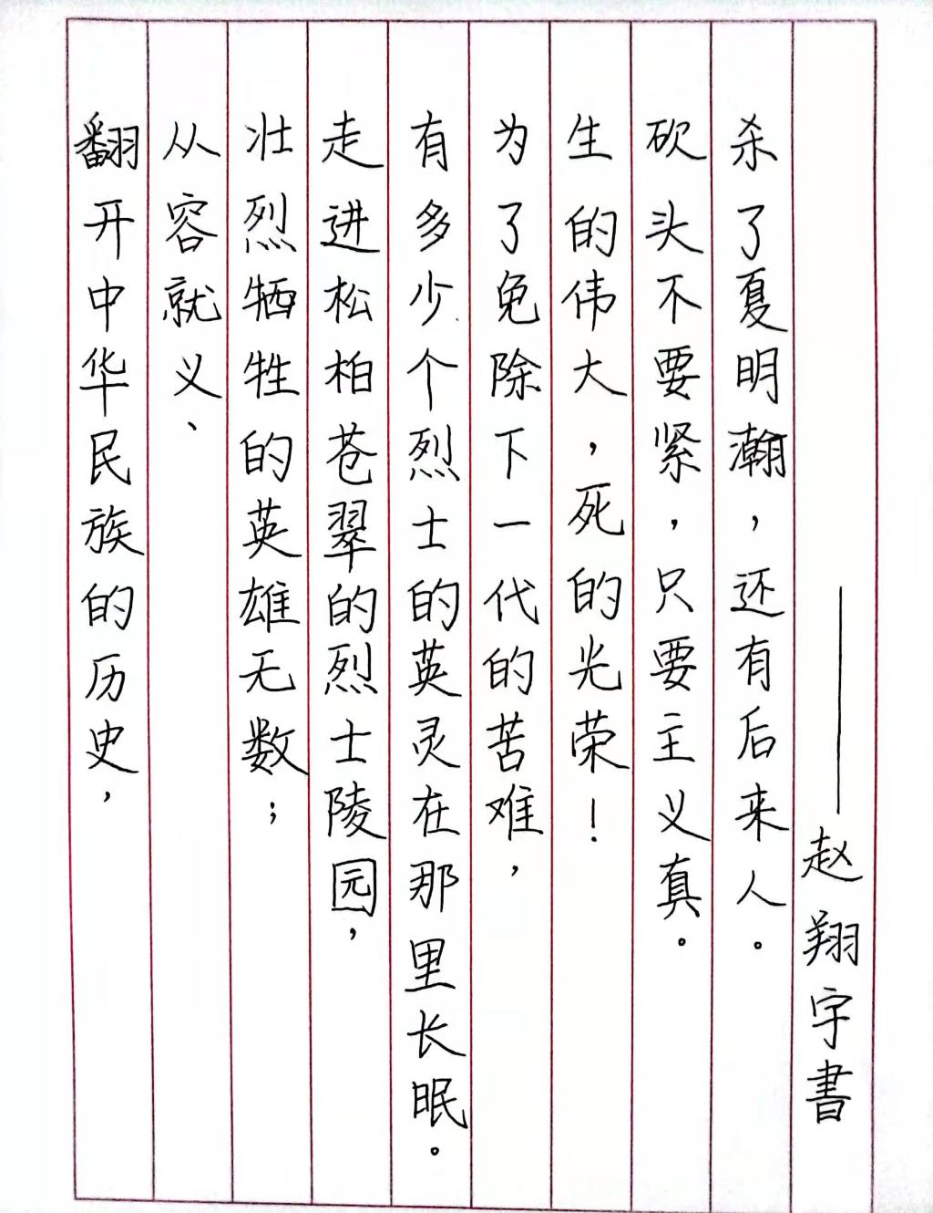 满山的杜鹃,四月的雨。清明时节,只得把怀念托付于清风,让坟前野花装点,以告远逝的祖先。每当清明,脑海里不禁浮想起烈士们为了祖国付出了一切,为了人民献出了自己宝贵的生命。他们有着文天祥“人生自古谁无死,留取丹心照汗青”的赤子之心。想到这些,我的内心也是满腔热血。烈士们,你们就像那美丽的鲜花,在祖国大地上散发出阵阵花香,让祖国的每一个角落都充满生机与希望。从古至今,英雄历历,有救民于水火的英雄;有浴血奋战、征战沙场的英雄;有为了国家和民族,献出宝贵生命的英雄;更有的在默默负重前行的英雄。他们“捐躯赴国难,视死忽如归”, 展现出天下兴亡,匹夫有责的爱国情怀,凝聚成百折不挠、宁死不屈的民族气节,构筑起一座座不朽的精神丰碑,通往我们的幸福之路。