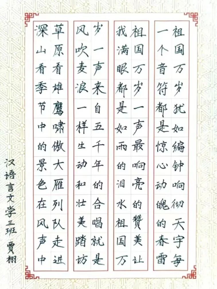 汉字书法,似无言的诗,若无行的舞,如无图的画,像无声的乐,这独特的富有美感的艺术,拥有无限魅力!书法是中华民族的文化瑰宝,是人民文化的宝贵财富,更是民族文化的象征,以汉字为载体,与多种艺术相结合,承载着传统文化和民族精神,每一横都是担当,每一竖都是成长,每一捺都汇聚力量,每一点都饱含希望。