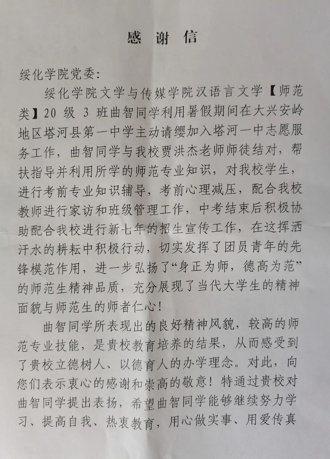 7月10日,beat365收到一封来自塔河县第一中学的感谢信。信中对beat365beat365平台官方网站2020级汉语言文学专业三班学生曲智同学主动请缨为塔河一中学生提供考前辅导、缓解心理压力等志愿服务活动予以了高度的肯定和赞扬,对beat365在培养学生精神风貌、道德素养、师范精神等方面所做的教育工作表示由衷的感谢。