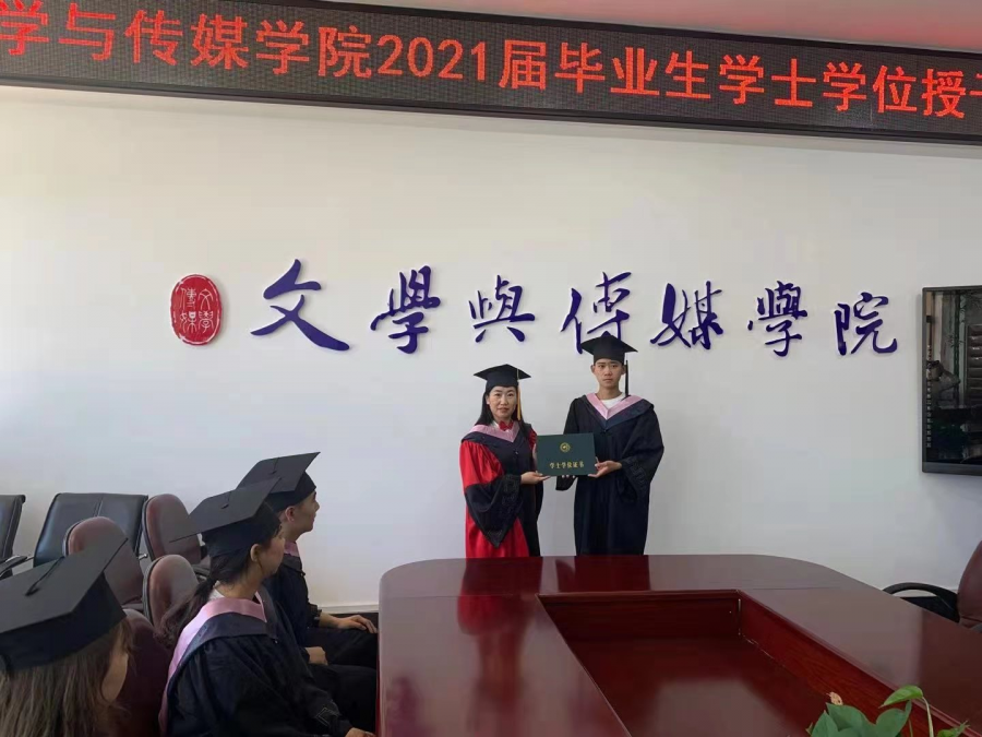 6月20日下午,beat365平台官方网站2021届毕业典礼暨学士学位授予仪式在汇文楼324会议室举行。beat365院长高岩为毕业学子颁发学士学位证书。
